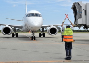 (写真・到着したJAL機を誘導する担当者=2024年5月、仙台空港)